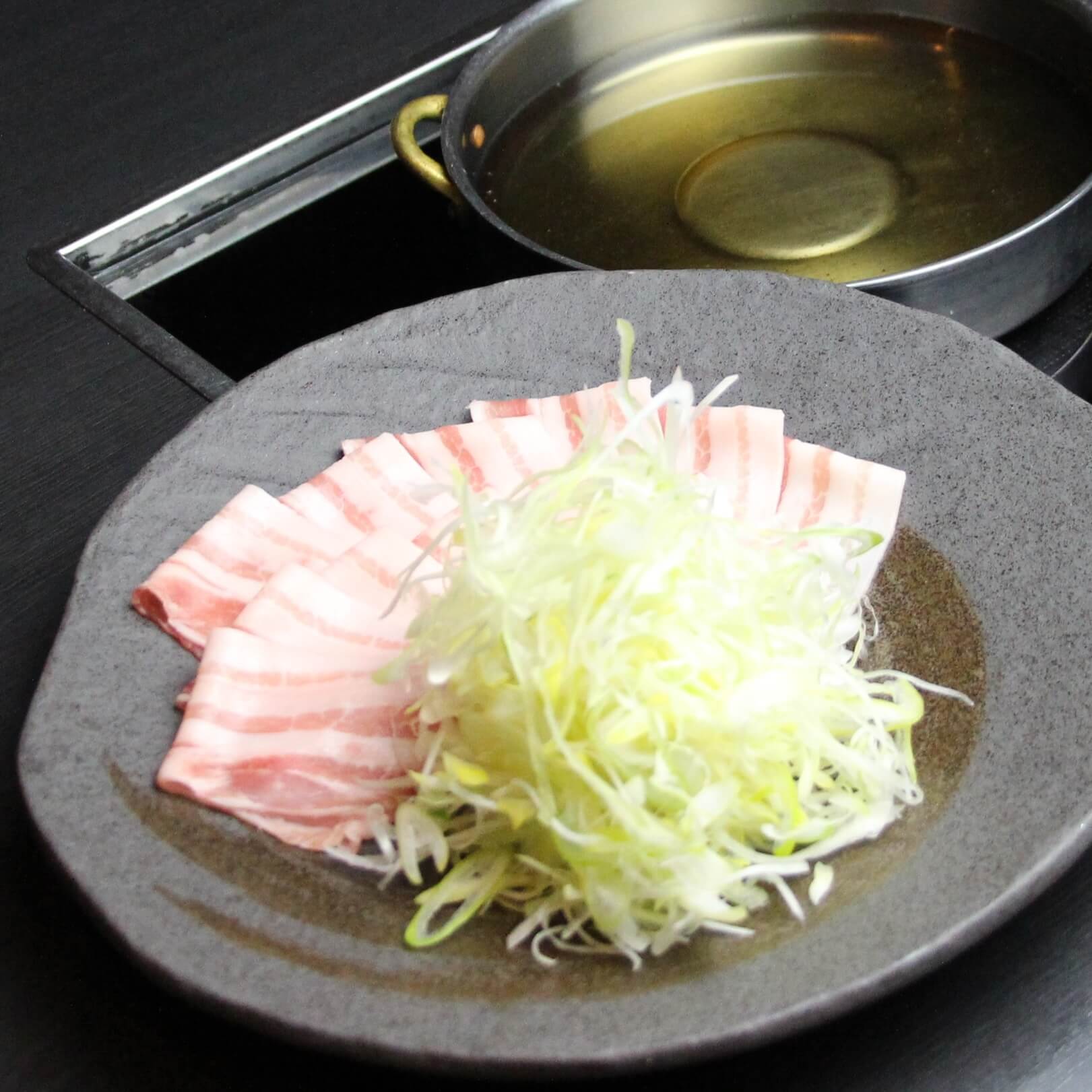 ③ 蕎麦出汁でつくる、鹿野豚のネギしゃぶしゃぶ
