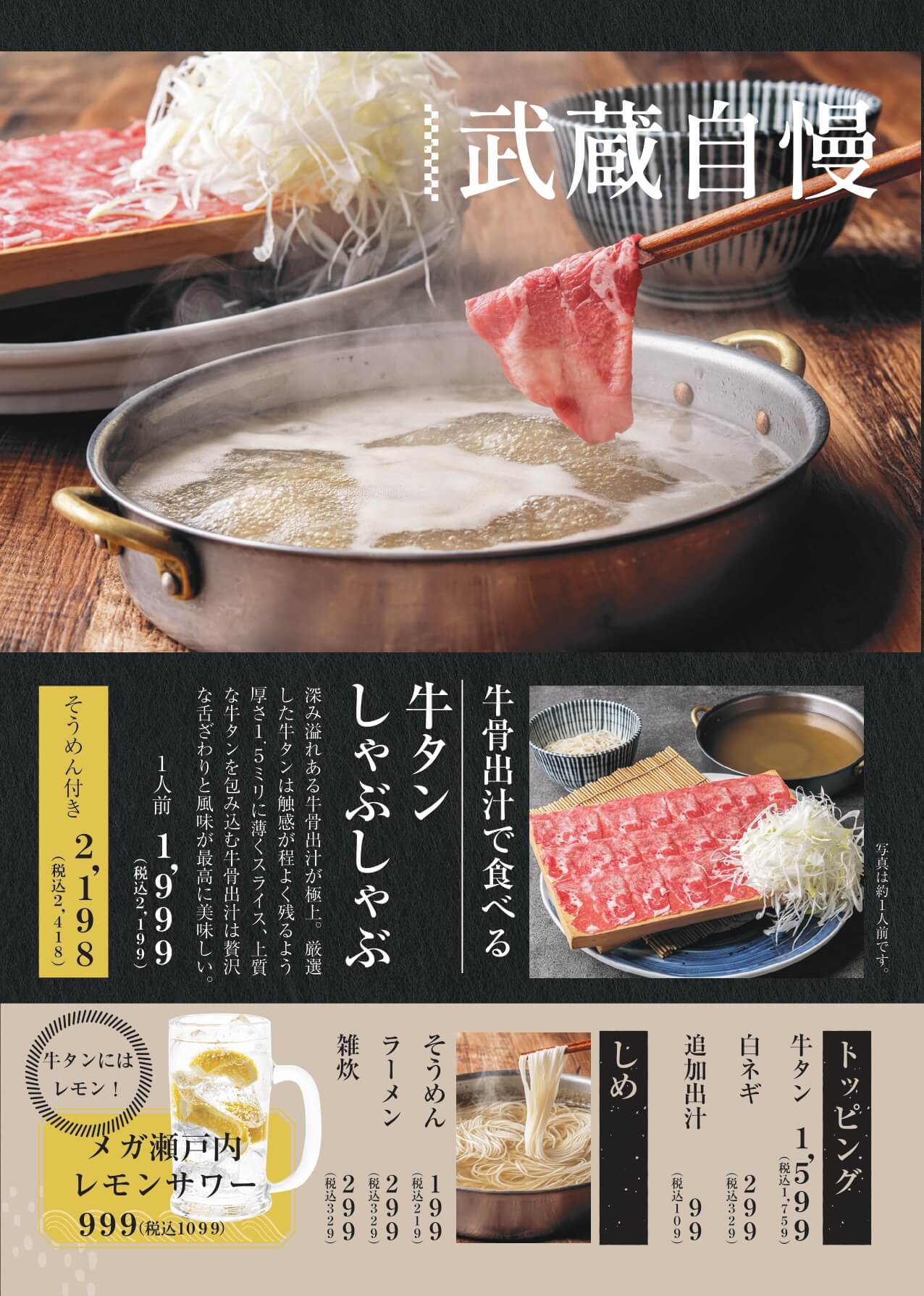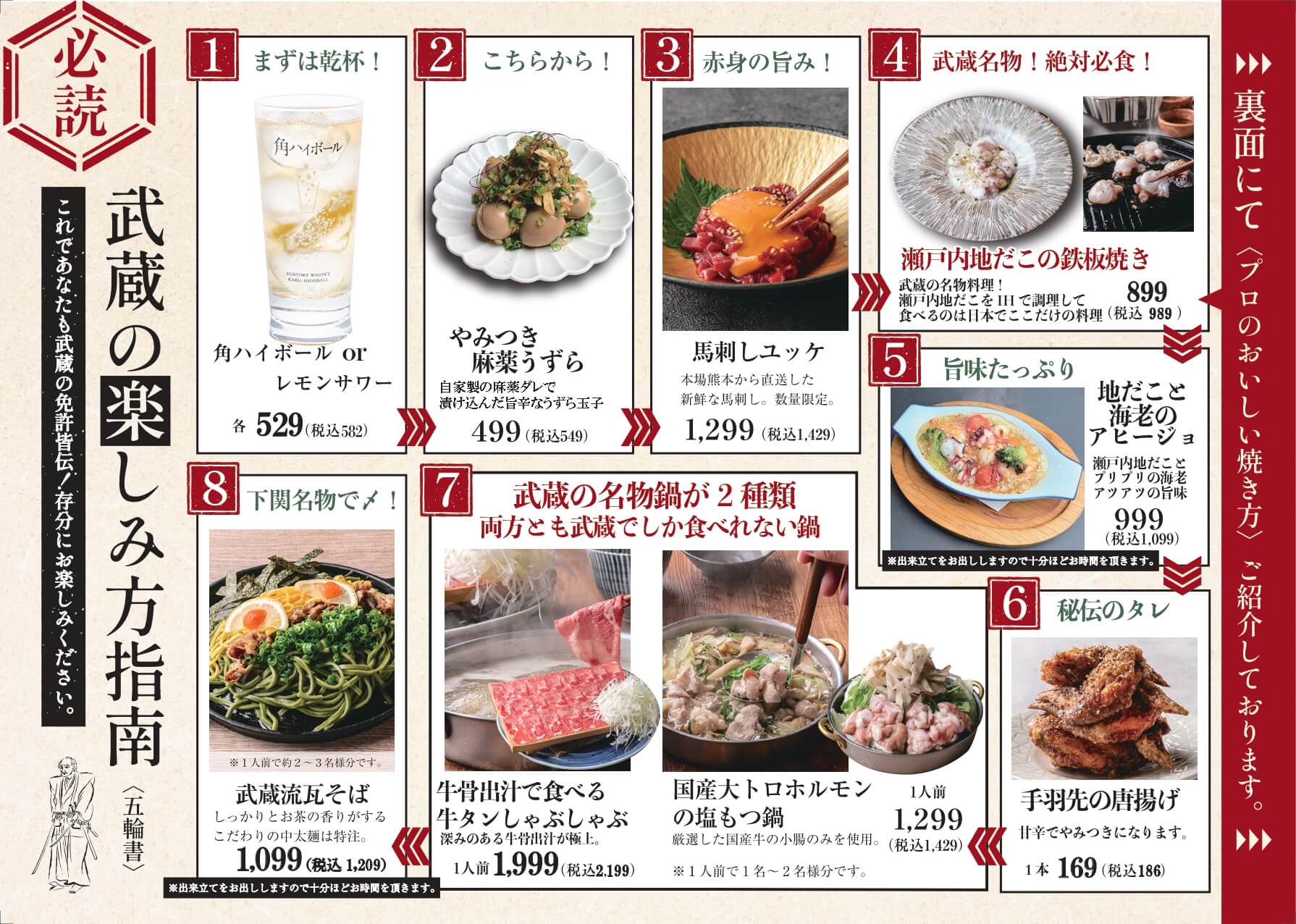 手羽先の唐揚げ 瀬戸内地だこの鉄板焼き 大トロホルモンの塩もつ鍋 山口名物!トラフグの薄造り 焼ポテトサラダ ちくわサラダの天ぷら 牛骨出汁で食べる牛タンしゃぶしゃぶ 瀬戸内地だことプリプリ海老のアヒージョ 山口名物瓦蕎麦